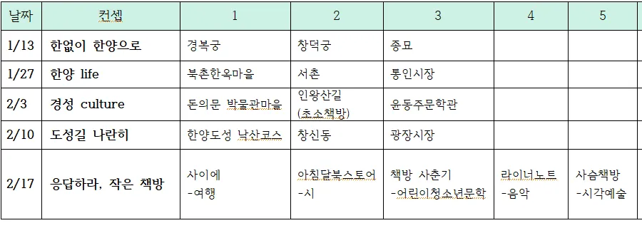 기간: 1/13-2/24 매주 금요일 10:00 - 15:00 (점심포함)