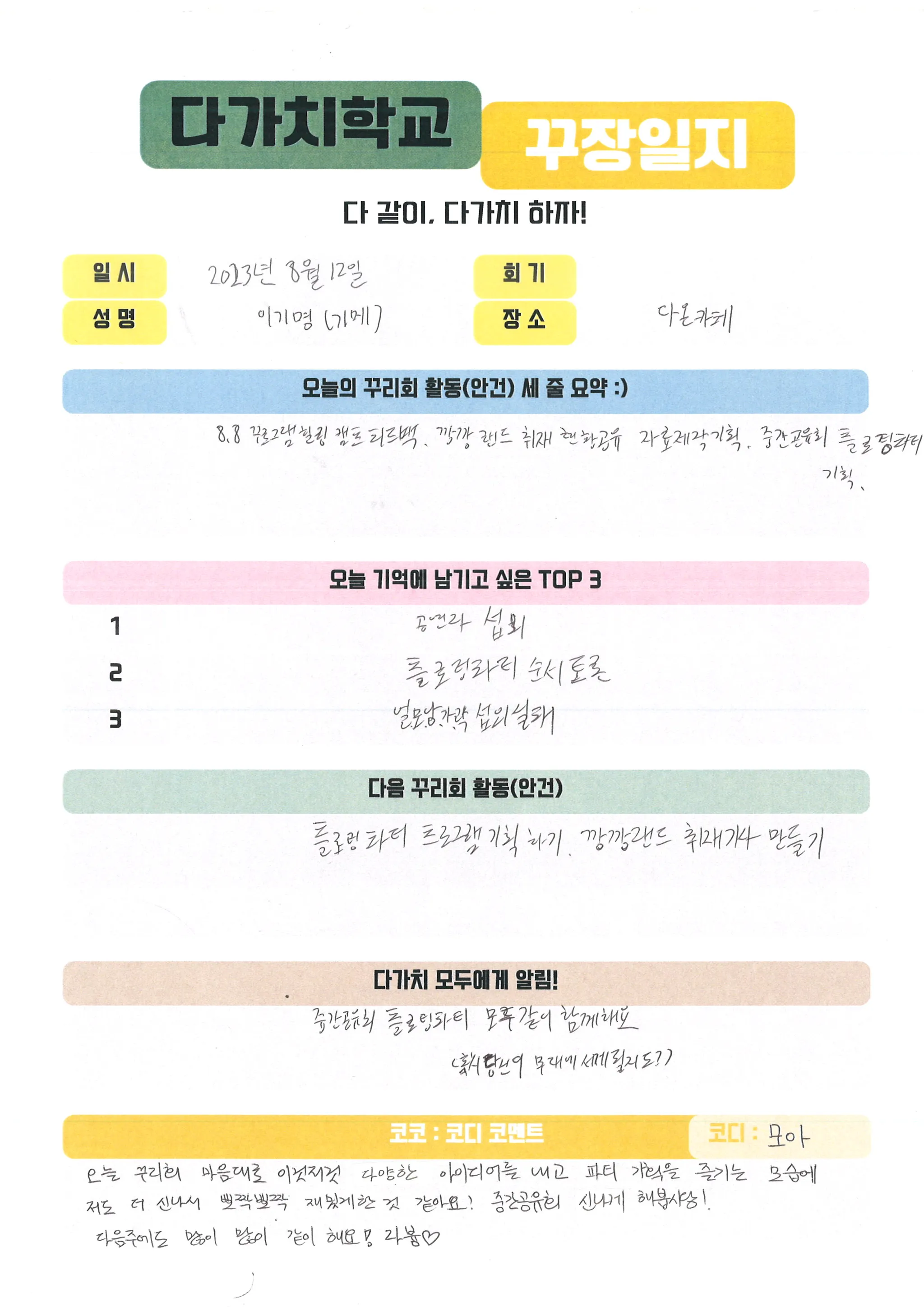 꾸리, 코디들의 아이디어와 취향, 재능으로 다가치를 가득 채웠던 여름방학이 벌써 거의 다 지나고 있네요