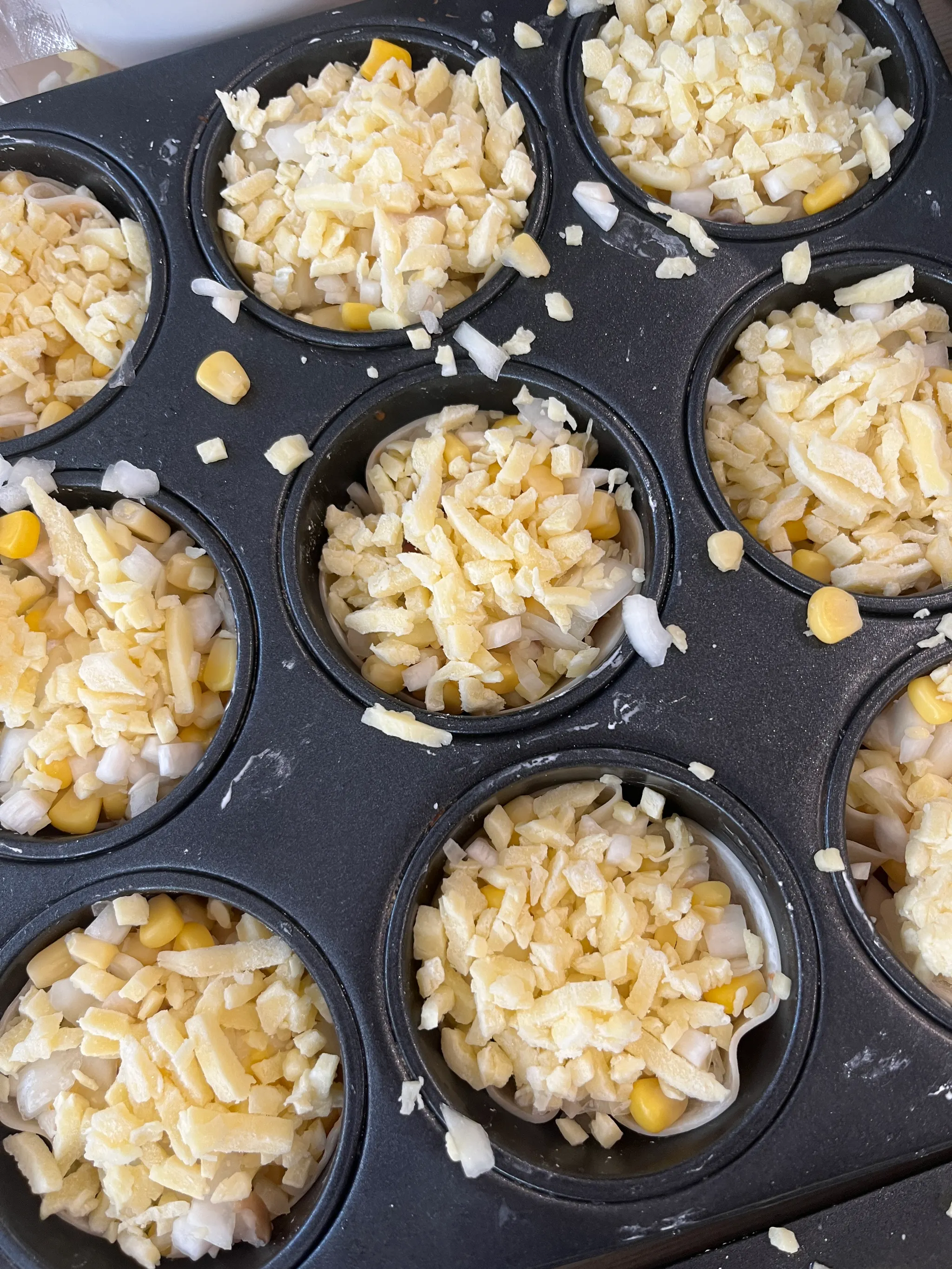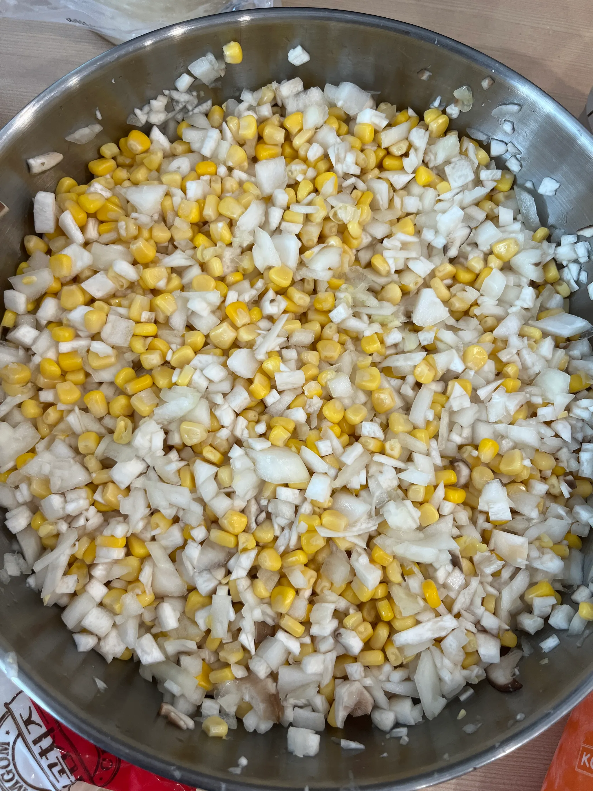 콘옥수수와 섞는다. 소량의 치즈도 넣는다 (그래야 먹으면서 치즈가 늘어난다)