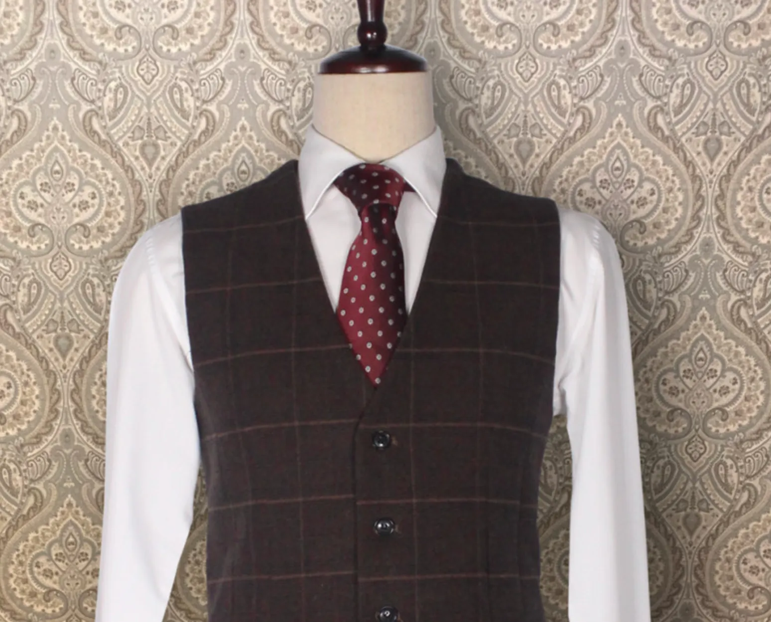 모직 다크브라운 체크-자켓XL, 바지XL, 조끼XL, 셔츠100, 중절모 브라운