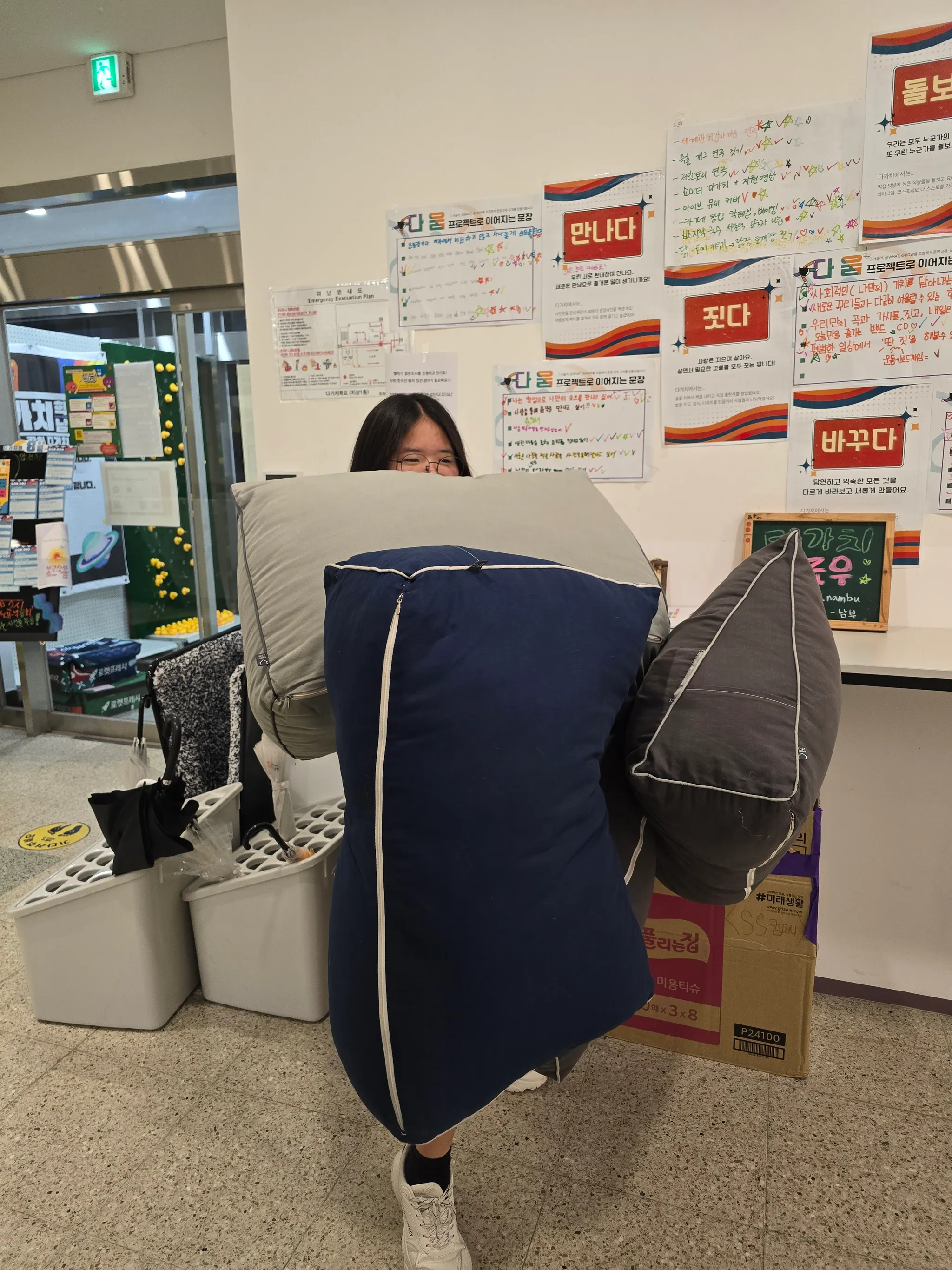 애정과 열정으로 평일에도 모여서 영화부스를 꾸미고 상영회를 준비하는 꾸리회 몸집만한 쿠션을 3~4개씩 번쩍번쩍 들어서 옮기고, 1층 카페에서 홍보하던 전시물들도 빛터로 이전하여 영화상영 공간을 꾸몄어요! 상영회 진행도 최종 점검했답니다!