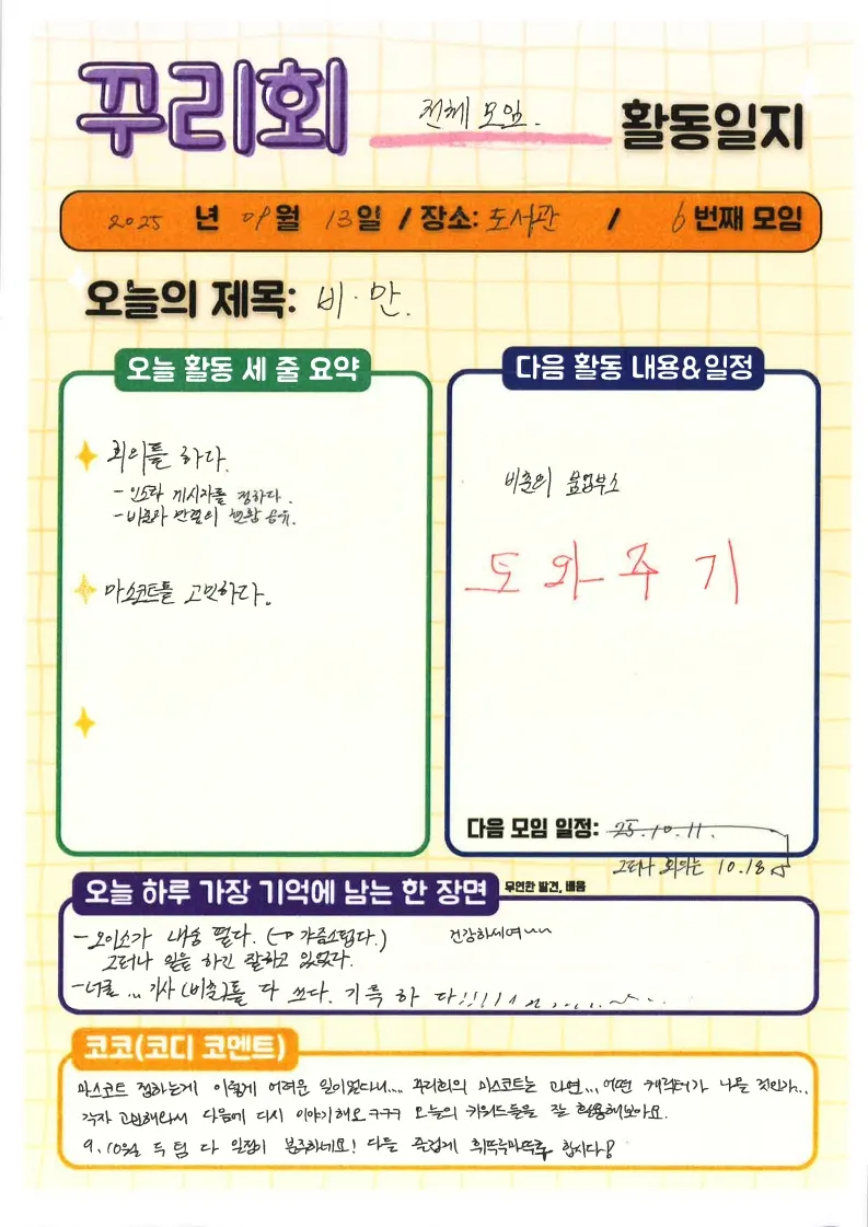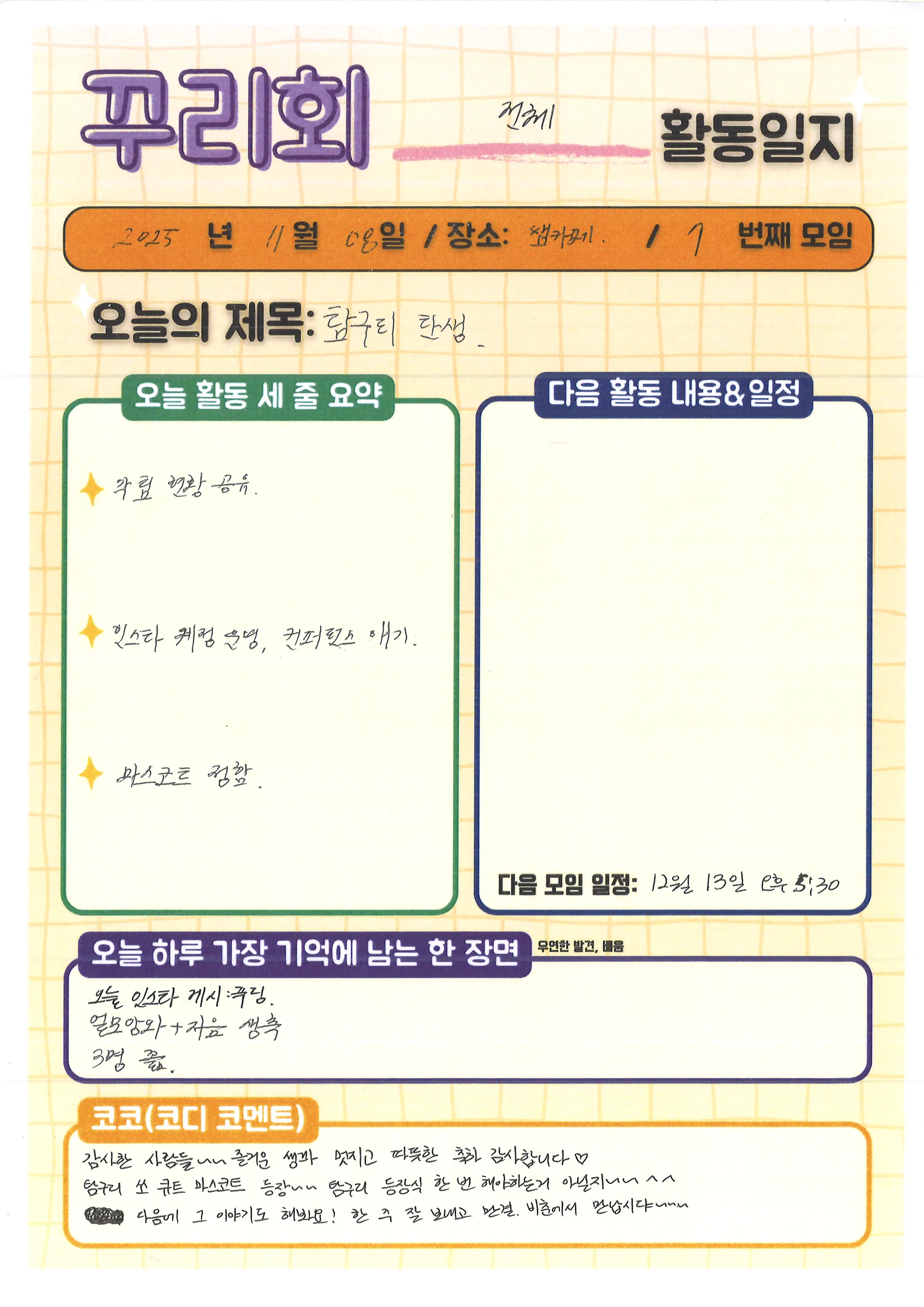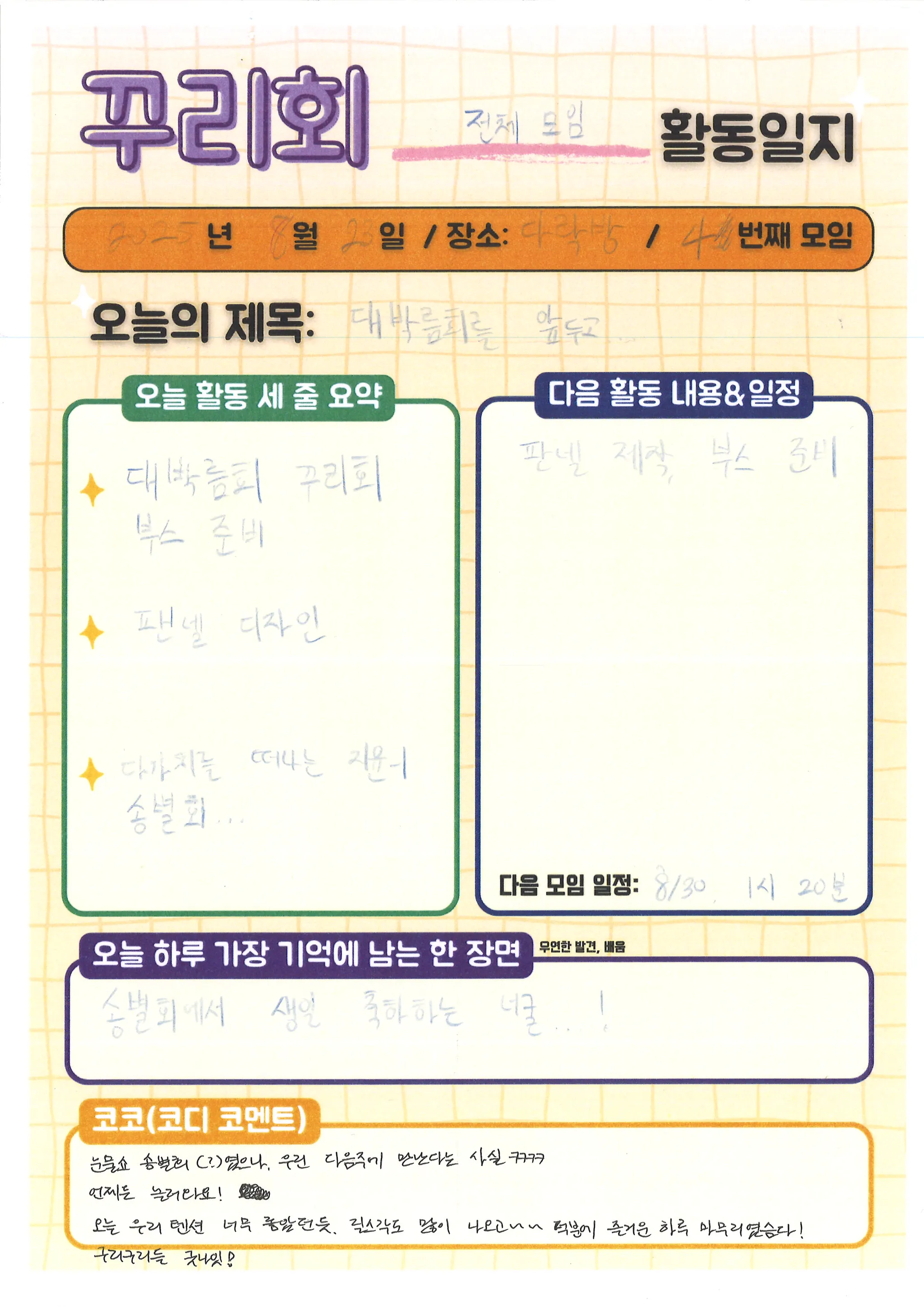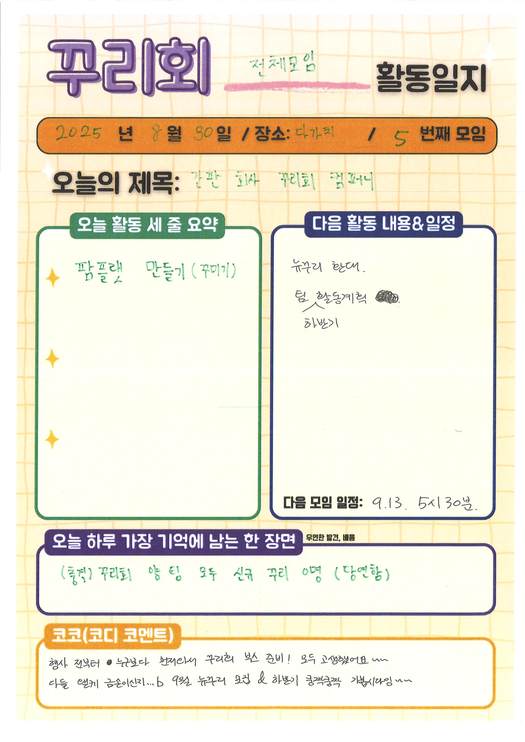 - 매 활동 종료 후 꾸리회 활동일지 작성 - 작성 후 모아에게 오늘 활동 내용 전달 및 코코 작성 요청 (모아가 없다면 자리 위에 올려두고 꾸장이 연락주기~)