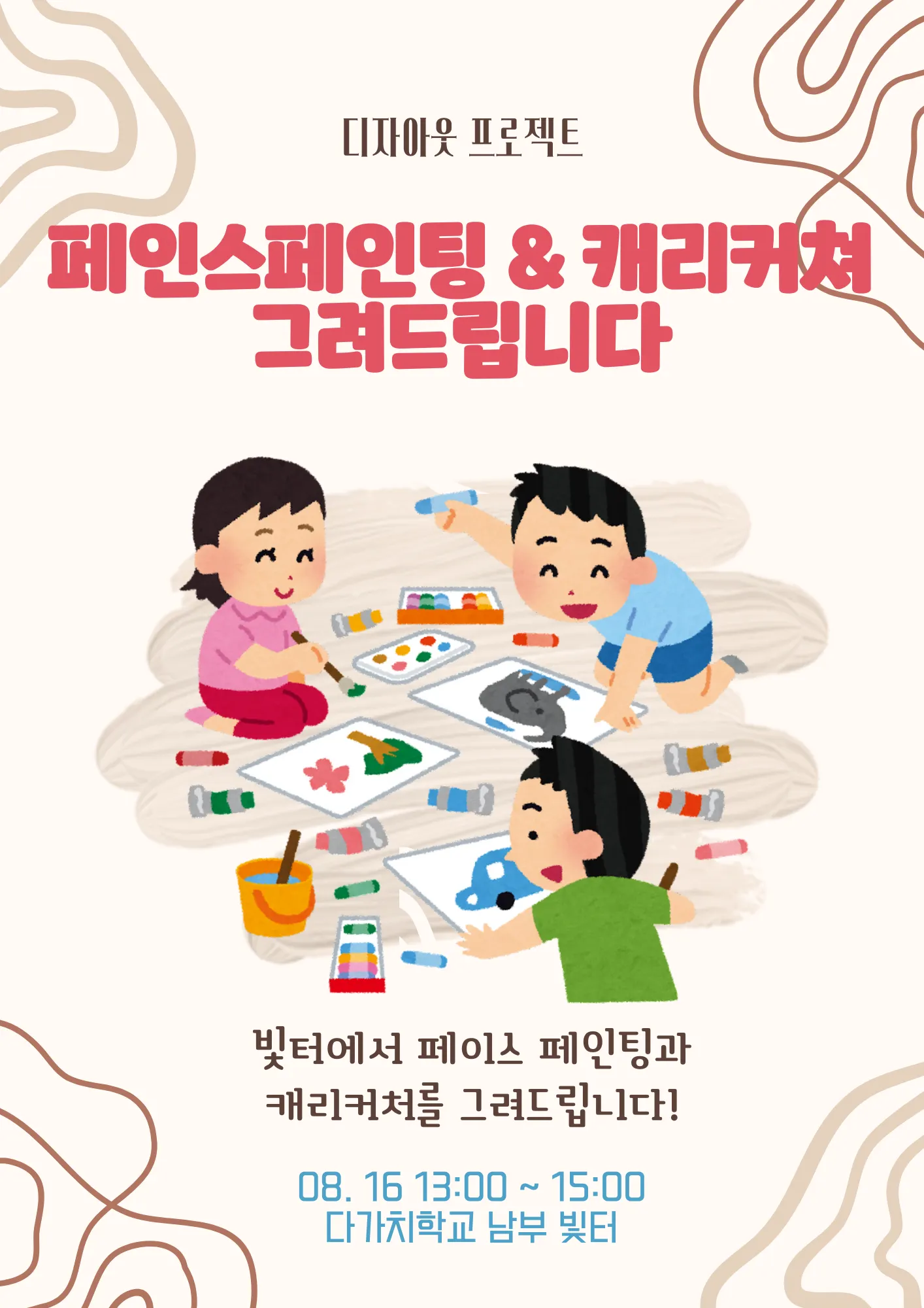 8월 16일 디자아웃 름름 사건 행사에서 진행할 페이스페인팅&캐리커쳐 부스 준비 진행