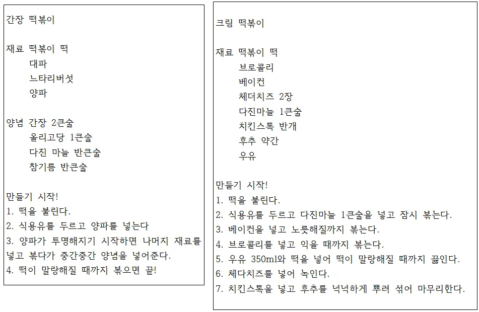 프로젝트 전에 다양한 맛의 떡볶이 레시피를 검색한 뒤 제일 쉬워보이는 것으로 재료를 준비했다. 바로 크림 떡볶이, 간장(기름) 떡볶이, 기본 떡볶이 저번 주에 레시피를 알고 있는 게 등안 밖에 없어서 나와 림보가 상대적으로 헤맨 것 같아 레시피도 준비했다. 캬아 이 준비성