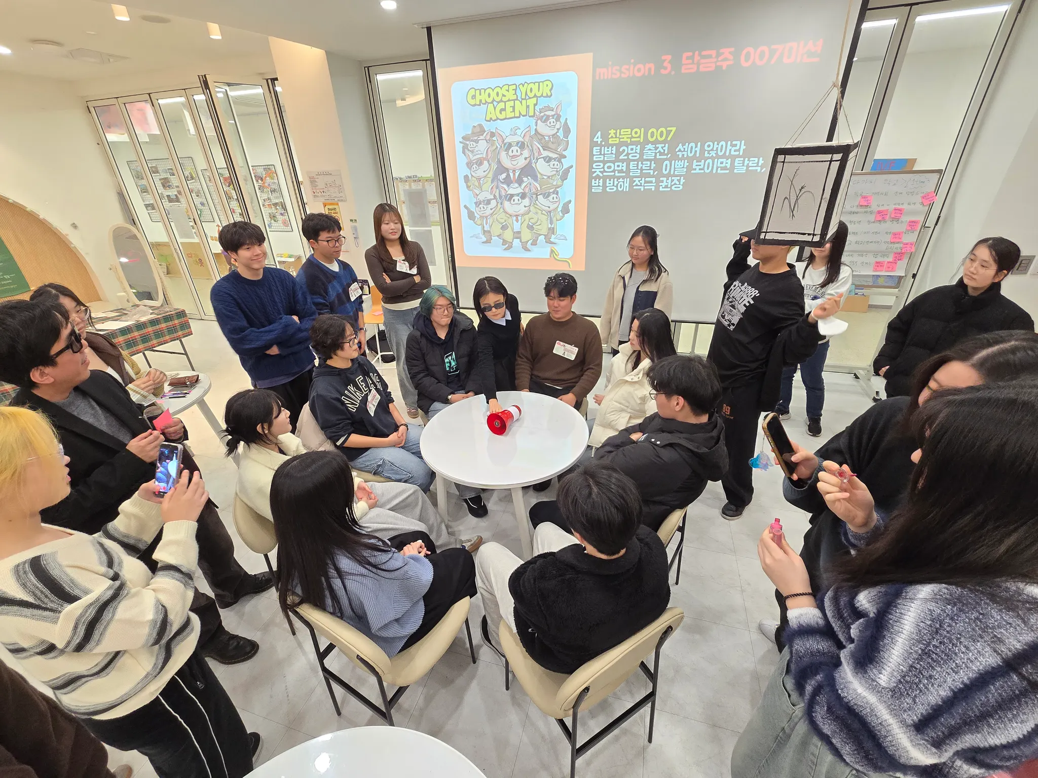 입장 | 15:40 | 요원 신분 확인 - 00돼7 요원증, 코드네임 적기 - 능력치 : 체력/집중력/흥/먹성(돼지컨셉) 점수 | |