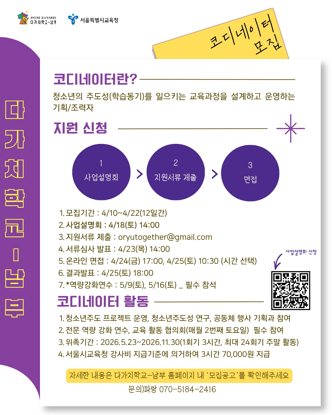 다가치학교의 청소년 주도 교육과정을 설계하고 운영할 2026 코디네이터를 모집합니다.