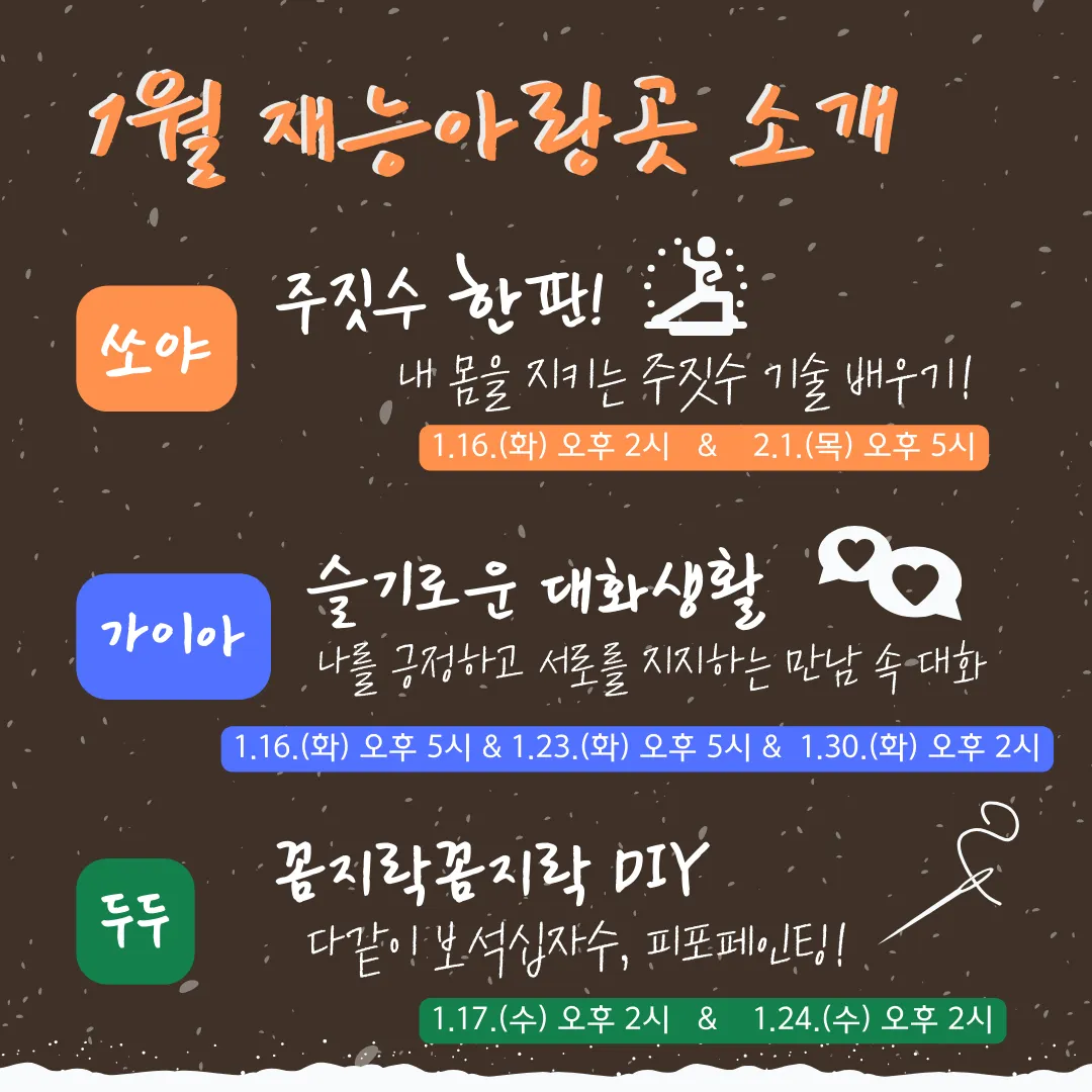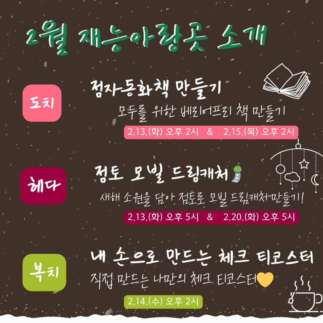 2.우리만의 동화책만들기 <브레인스토밍으로 개인의 이슈나 망상, 경험 나누기 -> 책제작(그림,글쓰기) -> 오디오북(더빙)> | (1) 1/23 (13:00~15:00) (2)1/30 (14:00~16:00) / 2/6(14:00~16:00) / 2/13 (14:00~16:00) | ||
