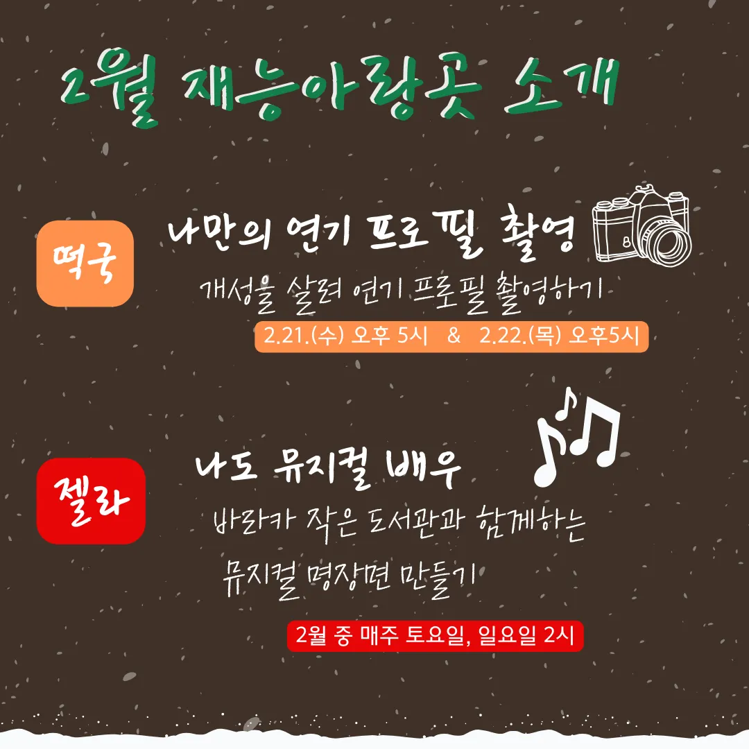 ‘재능아랑:곳’은 코디들이 본 교육과정 프로젝트 외 자신의 끼와 재능을 나눌 수 있는 다양한 활동의 기회와 장을 마련함