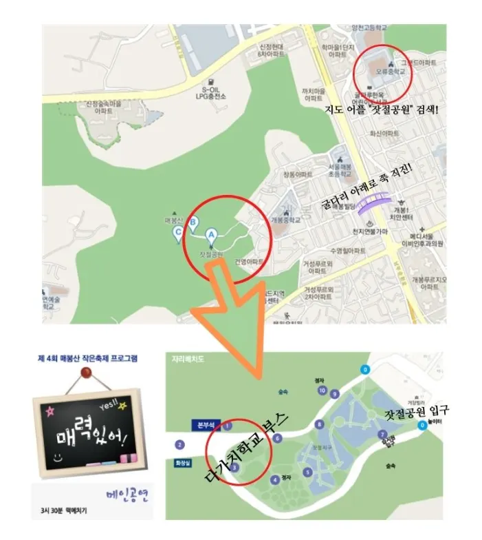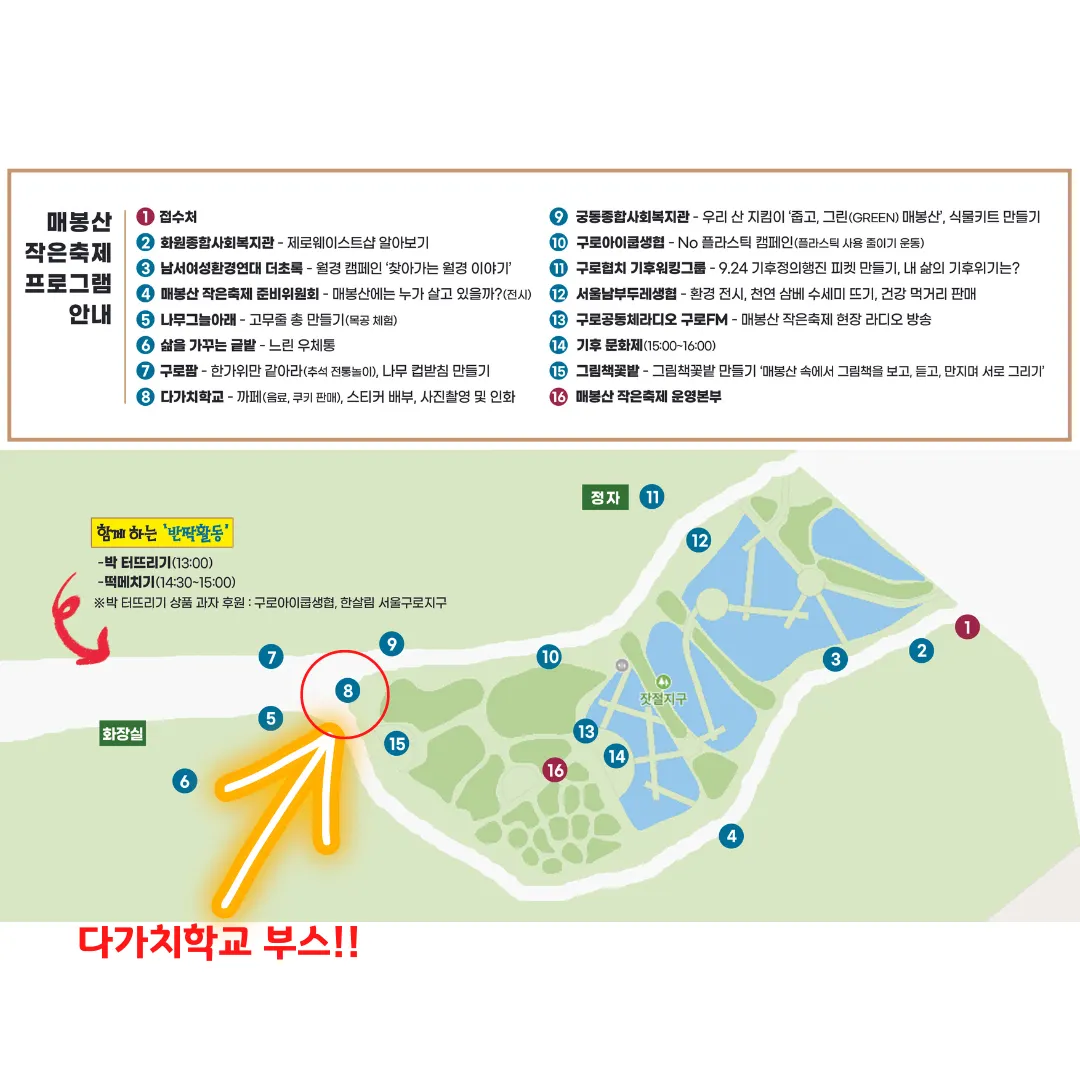 매봉산 축제 진행 시간 : 오후 1시~4시, 부스 준비팀은 12시 전까지 다가치학교로, 축제 참가 프로젝트 팀원들은 축제 진행 시간 동안 참여해주세요!