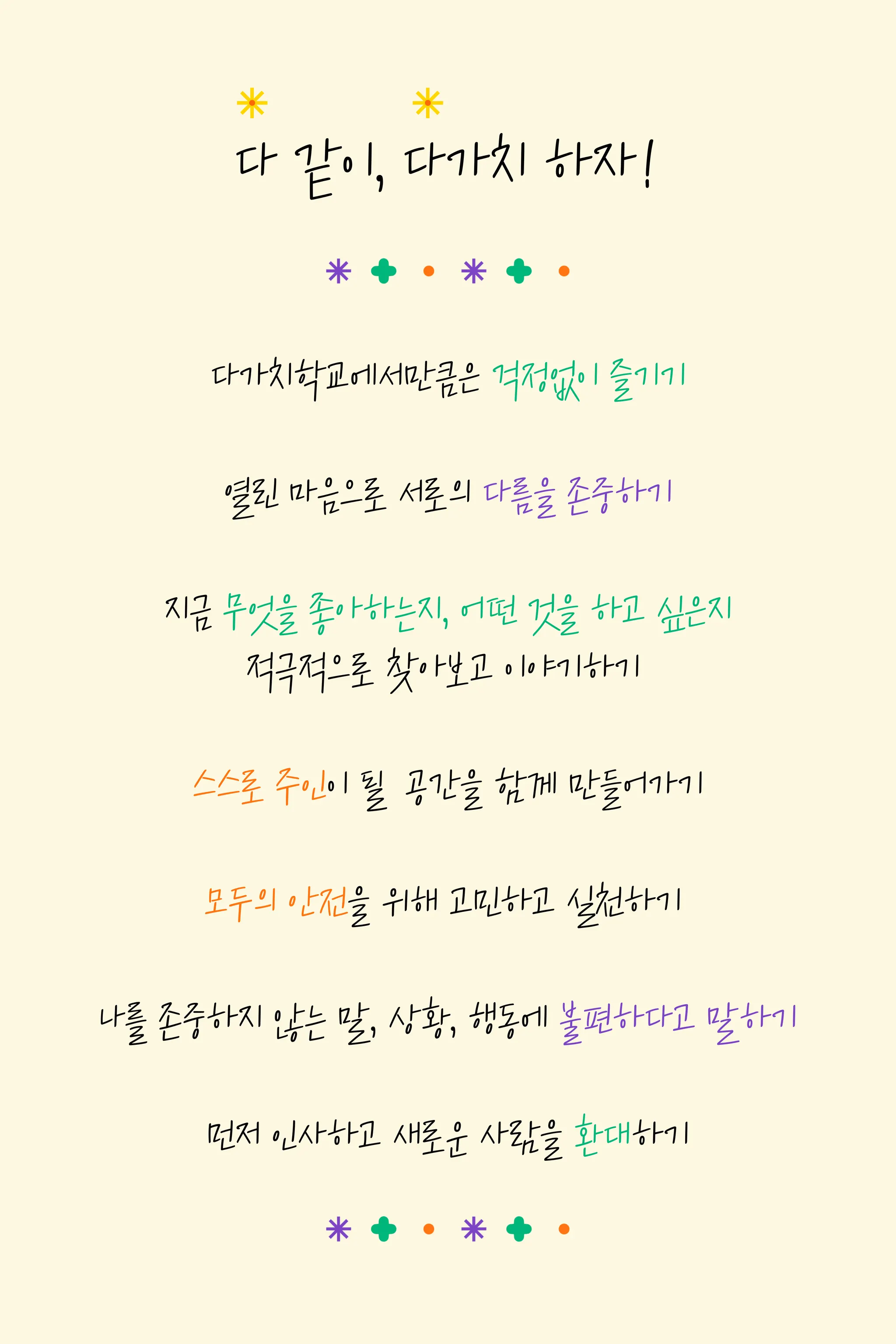 다가치학교는 청소년이 나를 발견하고 세상과 새롭게 관계를 맺는 배움터입니다. 누군가 가르치는 수동적인 배움을 넘어 자유롭게 스스로, 함께 도전하는 청소년 주도 프로젝트 활동을 통해 삶을 확장시켜나가는 경험을 지원합니다.