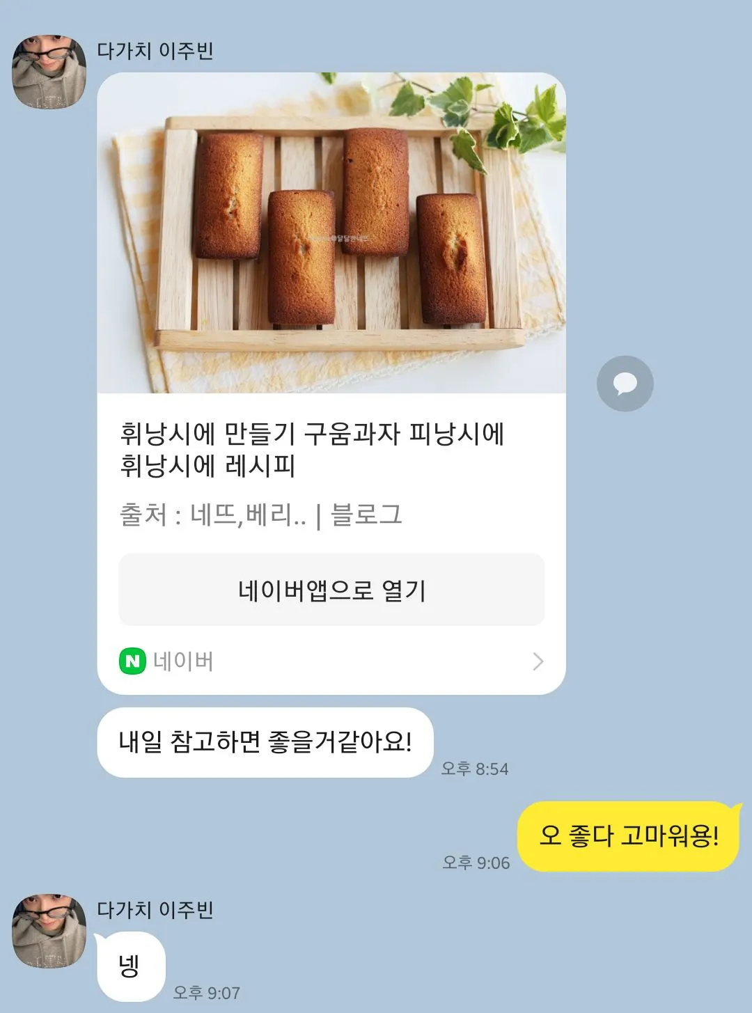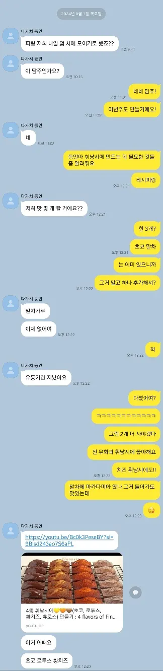이야기는 프로젝트 전부터 시작된다. 베이킹 관련된 건 모두 등안에게 물어보기로 해서(나 혼자 생각함) 등안에게 필요한 재료와 레시피를 물어봤다. 등안이는 말투가 참 귀엽다. 꼭 마지막에 ‘여’를 붙인다. 물어보니 자기 학교 말투라고 한다.