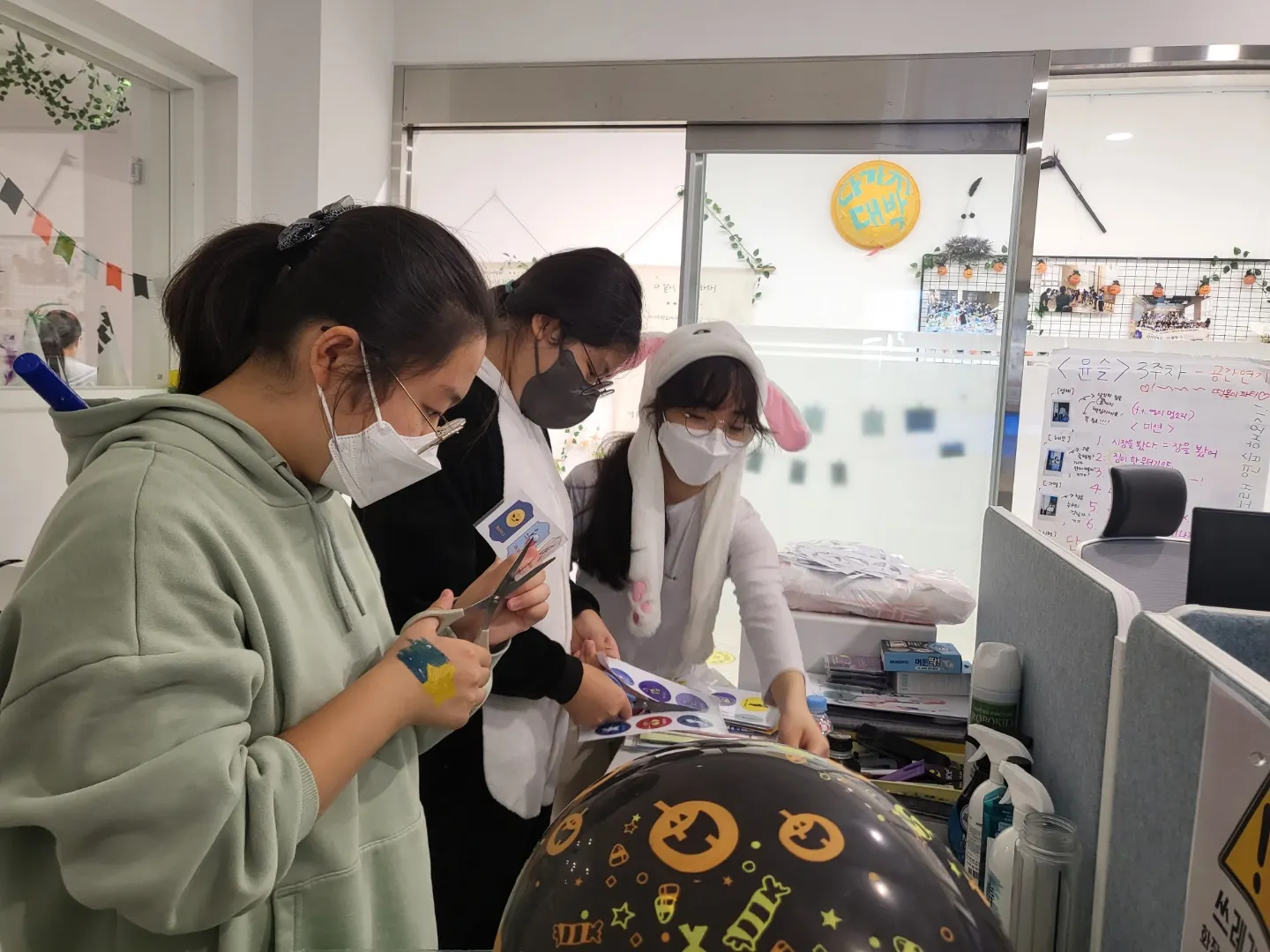 그러나 안타깝게도, 모두의 노력이 담긴 스티커는 할로윈 행사 당일까지 도착하지 않았다. 배송 출발 안내 문자가 왔으니 곧 오겠지, 팀원들과 코디네이터가 희망을 품고 간절히 기다려보았으나 2시 반까지 스티커는 감감무소식이었다. (알고 보니 배송 업체는 토요일 휴무였다…) 준비한 부스를 운영하지 못하게 될 수도 있는 절체절명의 상황. 결국 어쩔 수 없이, 도안을 인쇄해 코팅한 후 한땀 한땀 오리는 대안을 선택하였다.