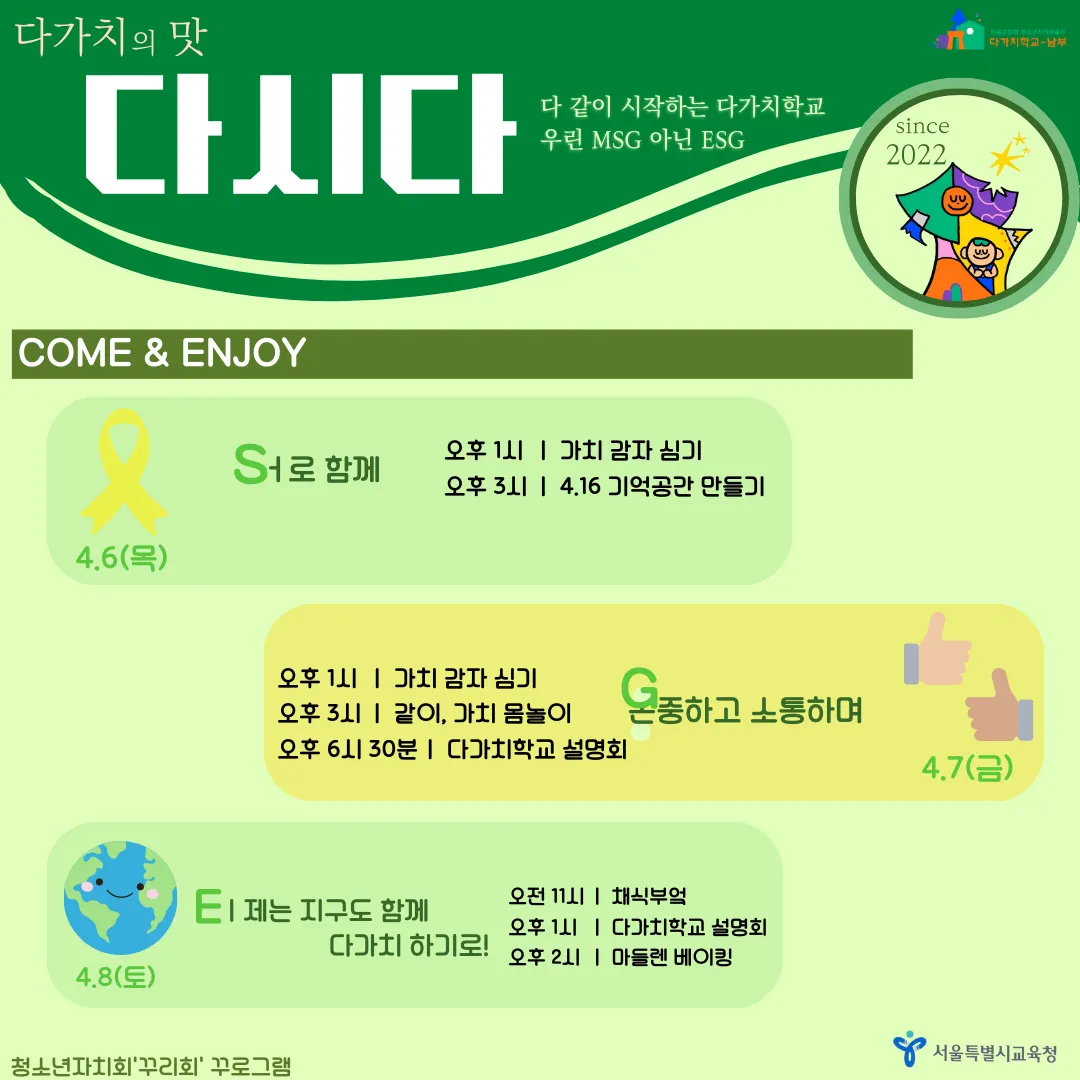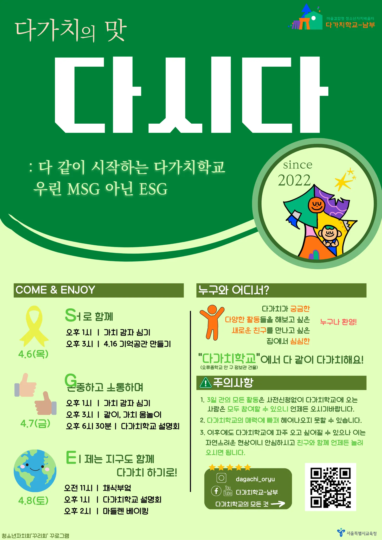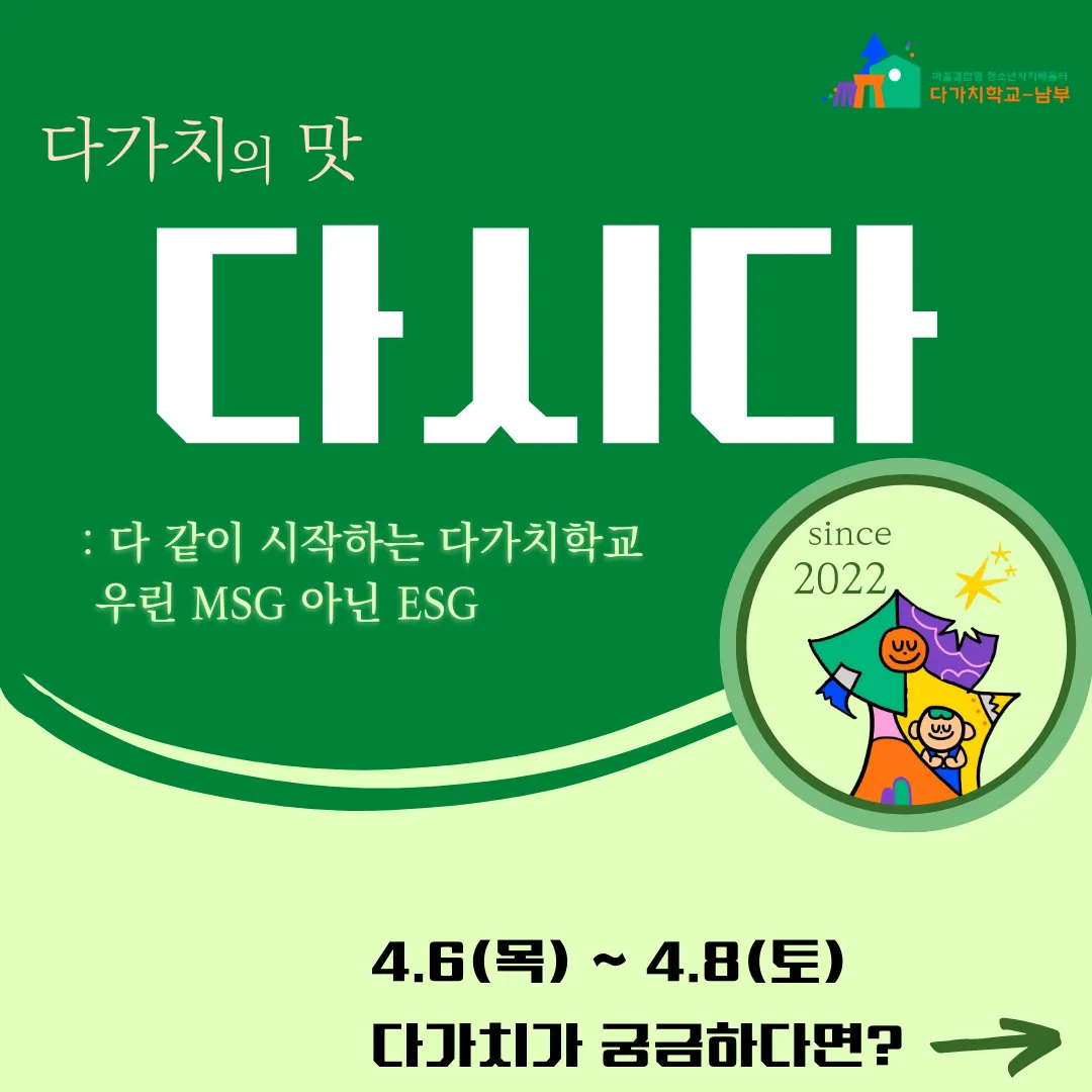 4.6(목) ~ 4.8(토) 3일 간 다가치학교에서 사전신청 없이 다가치학교에 오는 누구나 함께 활동할 수 있어요!!