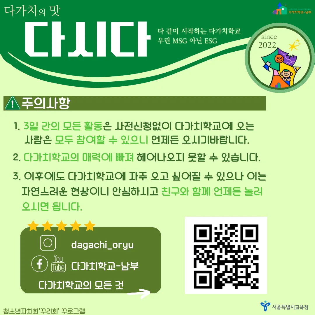 지난 1년 다가치학교에서 모두가 공감하고 실천했던 다양한 가치들을 담아 재미있는 프로그램을 진행합니다