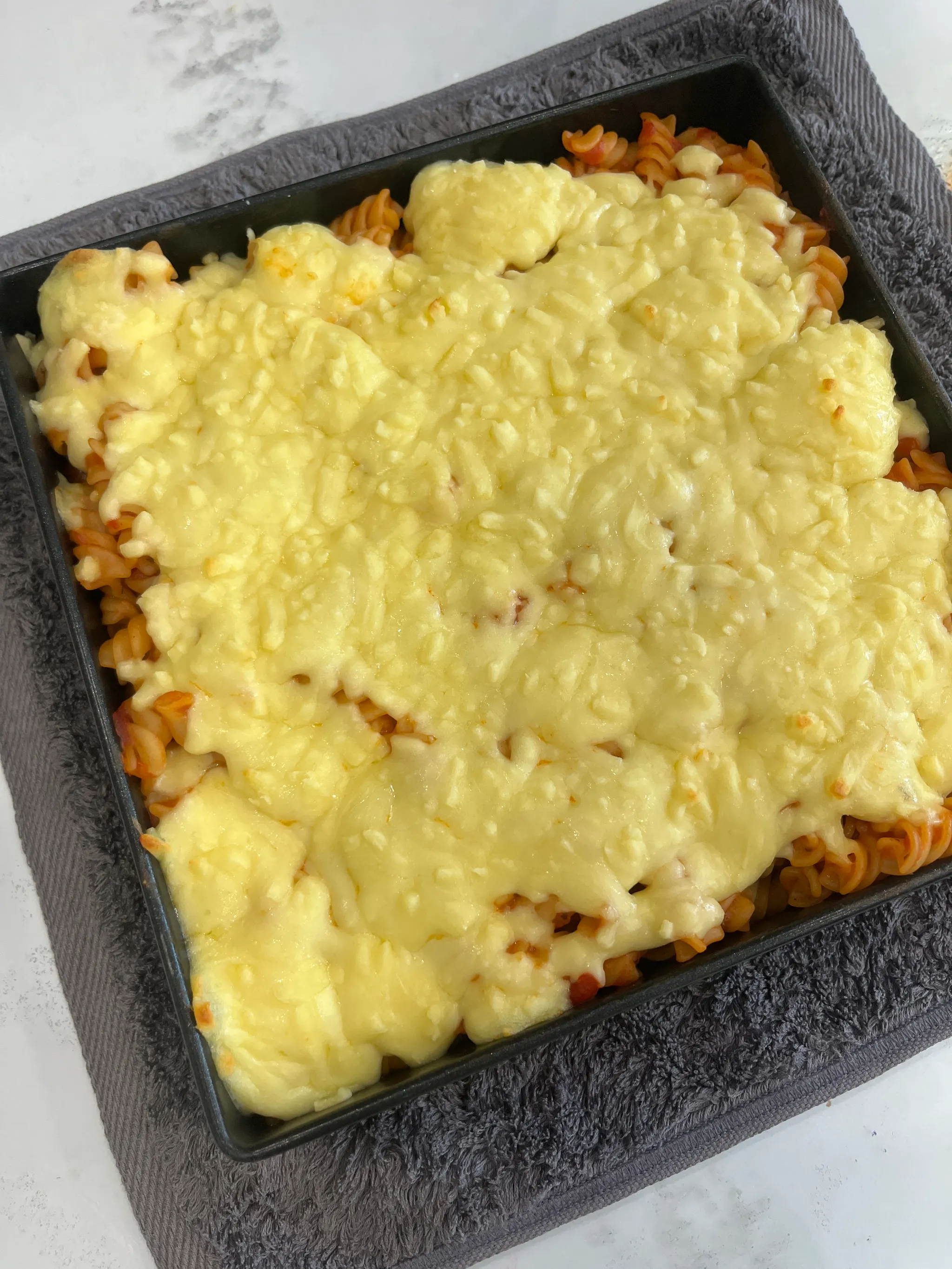 오븐 가능 용기에 완성된 파스타를 넣고 위에 치즈를 솔솔 뿌린다
