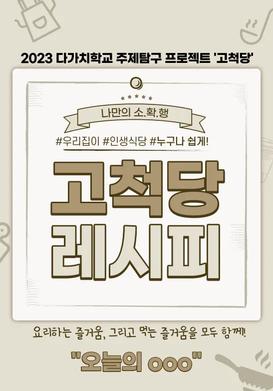 직접 급식표를 만들고 급식으로 나오면 좋을 것 같은 메뉴를 요리해 보고 싶은 꾸리, 요리에 대해 탐구하고 많은 사람들과 나누어보고 싶은 꾸리가 모여 만들어진 주제 탐구 프로젝트입니다! 고척고등학교에 재학 중인 꾸리들의 뭉침으로 ‘고척당’이라는 이름도 완성한 후 활동을 시작했습니다.