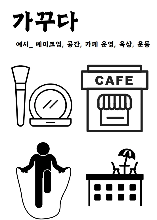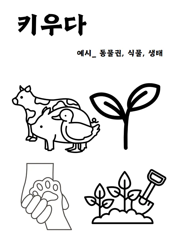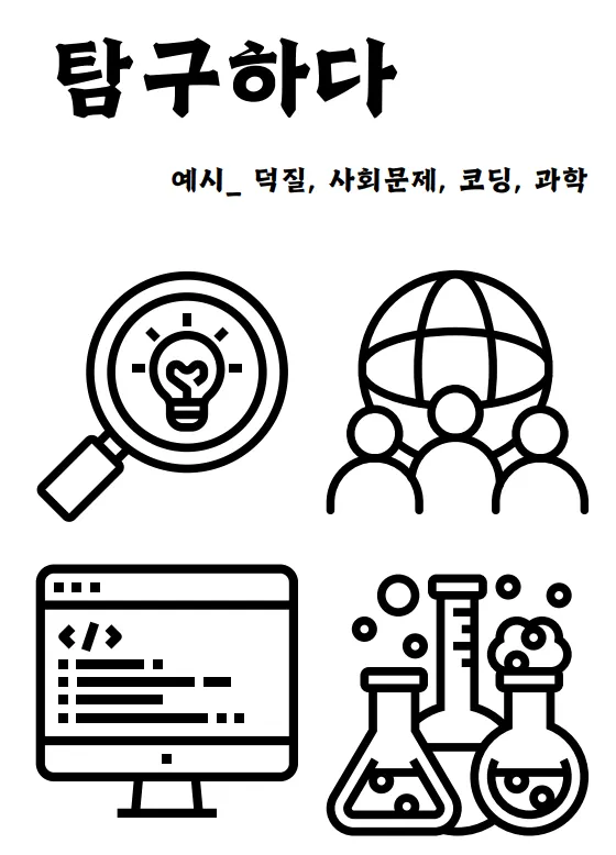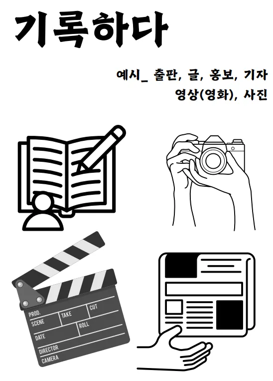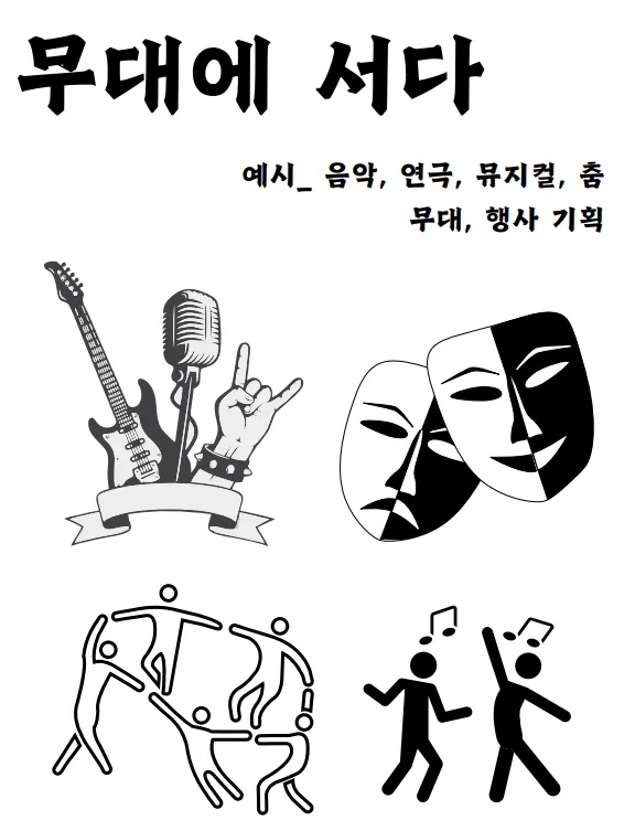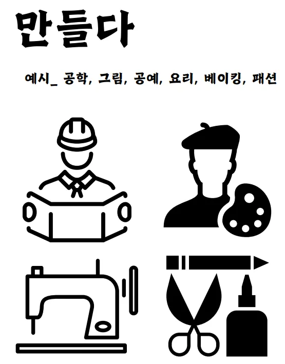 - 만들다 / 기록하다 / 무대에 서다 / 키우다 / 탐구하다 / 가꾸다