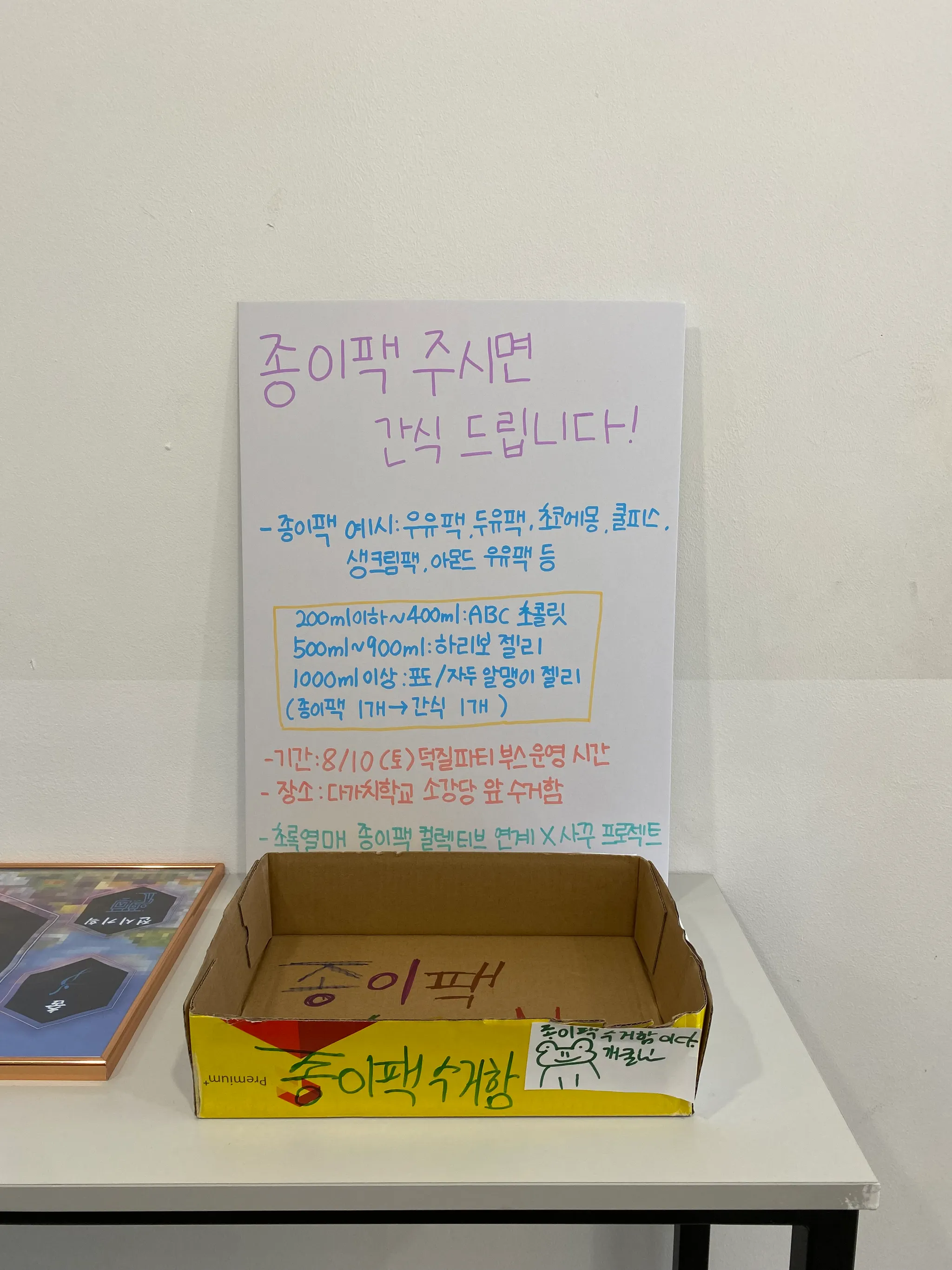 요약: 종이팩 컬렉티브와의 연계 방법을 고민해본 후 ‘수거 캠페인 진행 및 수거 후 작품 만들기’ 진행하기로 함.