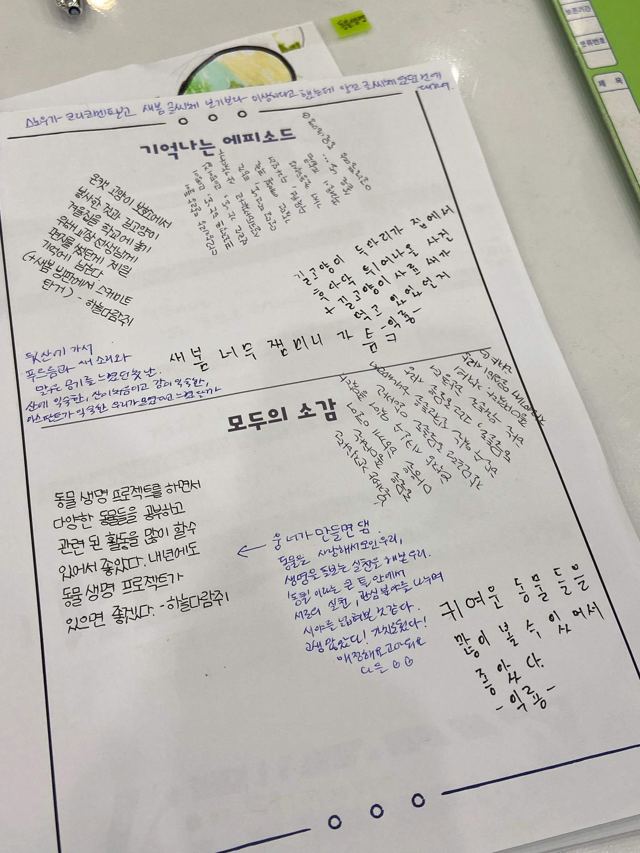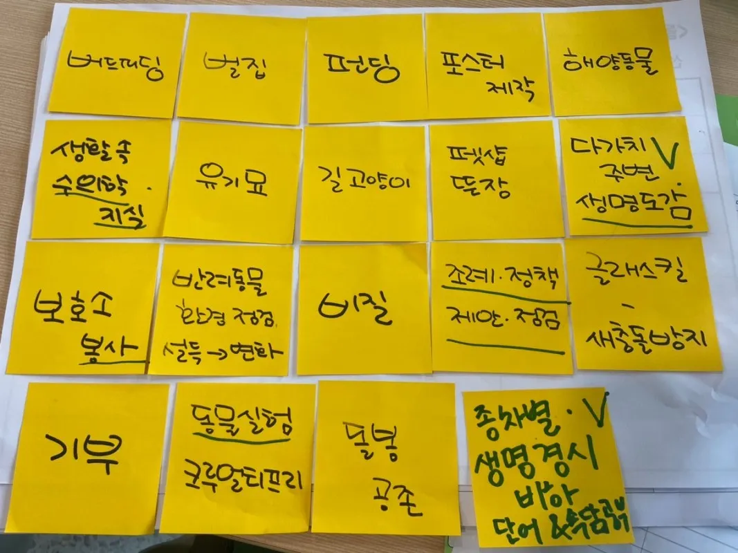 활동 초기에는 동물생명 프로젝트에서 해보고 싶은 공부와 실천이 무엇인지 나눠보고, 계획하는 시간을 가졌어요. 또, 다양한 생명들과 맺고 있는 관계에 대해 이야기하는 시간을 가졌답니다! 길고양이부터 도마뱀, 식물에 이르기까지 다양한 생명에 관심을 가지고 있던 우리들의 공통점을 발견한 시간이었어요