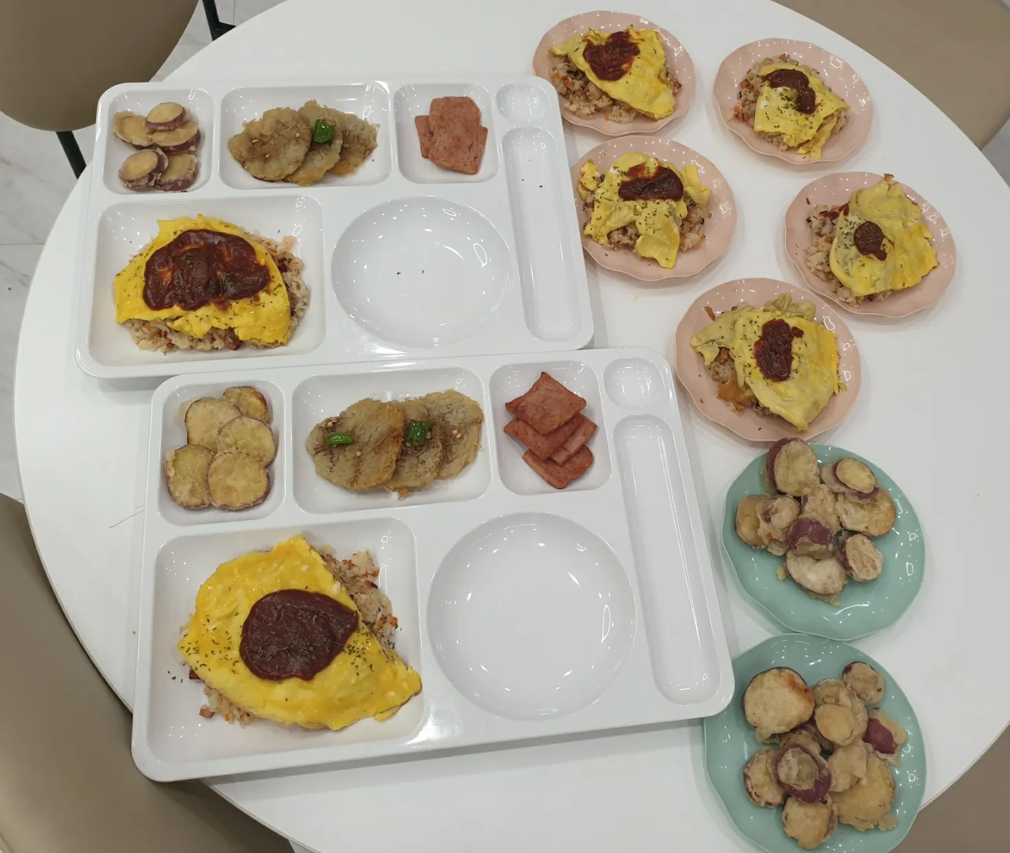 3) 오므라이스, 소면을 넣은 감자전, 고구마튀김